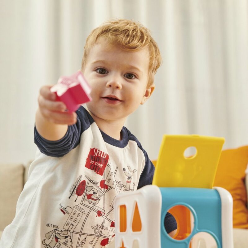 A kockát úgy terveztük, hogy serkentse a logikai asszociáció és a kéz-szem koordináció fejlődését a formaillesztő tevékenységnek és a kalapács használatának köszönhetően.