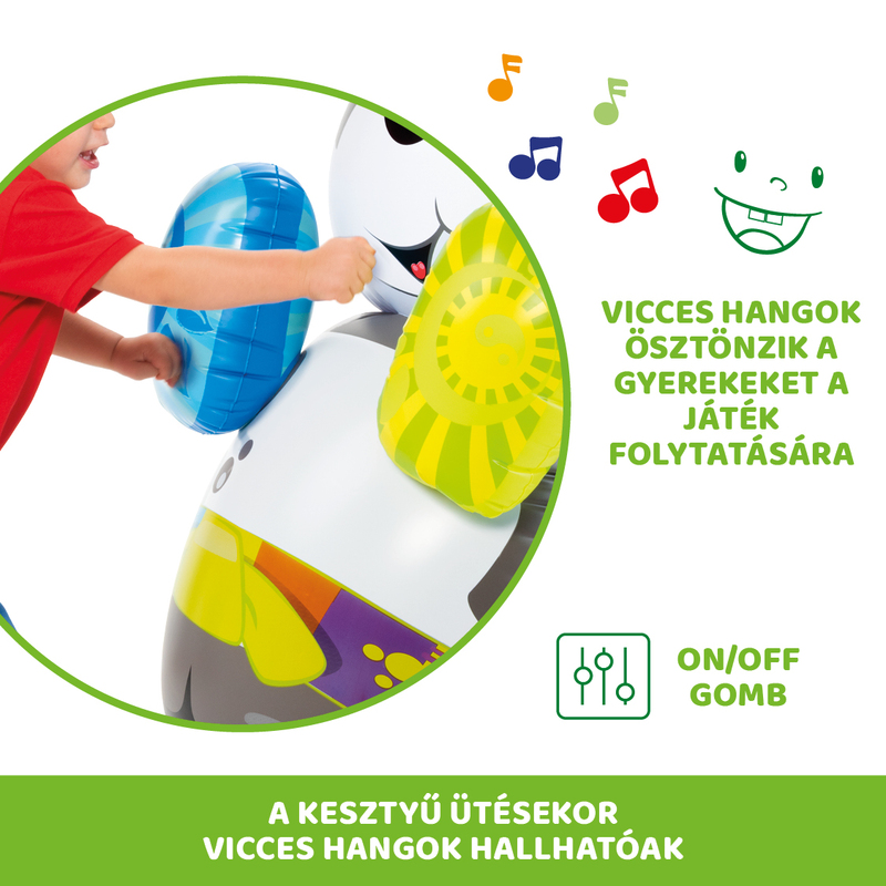 A kesztyű megmutatja a gyereknek, hogy hova kell ütni, így segít a finom motorikus képességeinek és pontosságának fejlesztésében. Valahányszor a kicsi megüti a kesztyűt, vicces hangok hallatszanak.