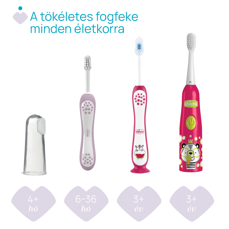 Tejfogak tisztítására. A finoman rezgő Chicco elemes fogkefe a kúpos technológiájú és a nagyon finom puha sörtékkel extra gyengéd a fogzománchoz és a fogínyhez. A fogak közti réseket a speciális sörték jobban elérik, és a lerakódások eltávolítása hatékonyabb, összehasonlítva egy hagyományos fogkefével.