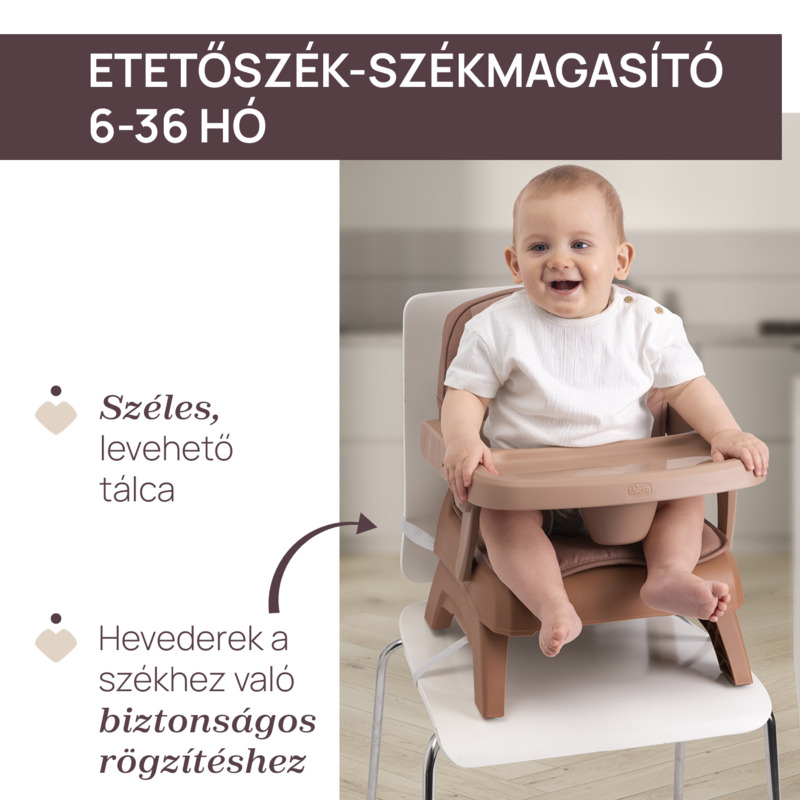 Két magasságba állítható ülésmagasító a sokoldalú használat érdekében.Puha, kényelmes huzattal rendelkezik a kényelmes ülés érdekében. A tálca kivehető, így könnyen tisztítható. A szék összecsukva szállítható.