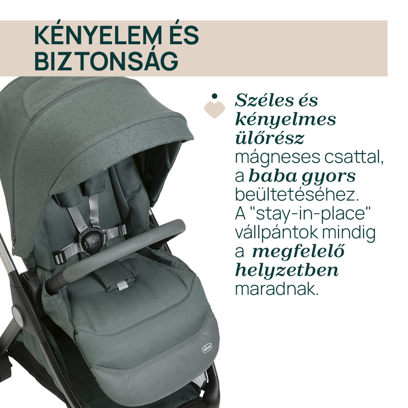 - A sportrész jól párnázott, magasabb elhelyezése nagyobb látóteret biztosít a gyermek számára. A mágneses csat lehetővé teszi a biztonsági övek gyors és egyszerű rögzítését.
