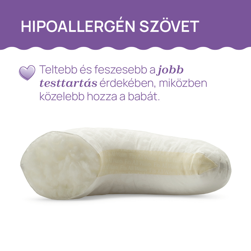 Egyedi töltet egyenletes száltöméssel, ami előnye, hogy a baba nem süllyed el, emellett testmérettől függetlenül minden édesanya derekára, hasára jól illeszkedik, anélkül, hogy formáját és rugalmasságát idővel elvesztené.